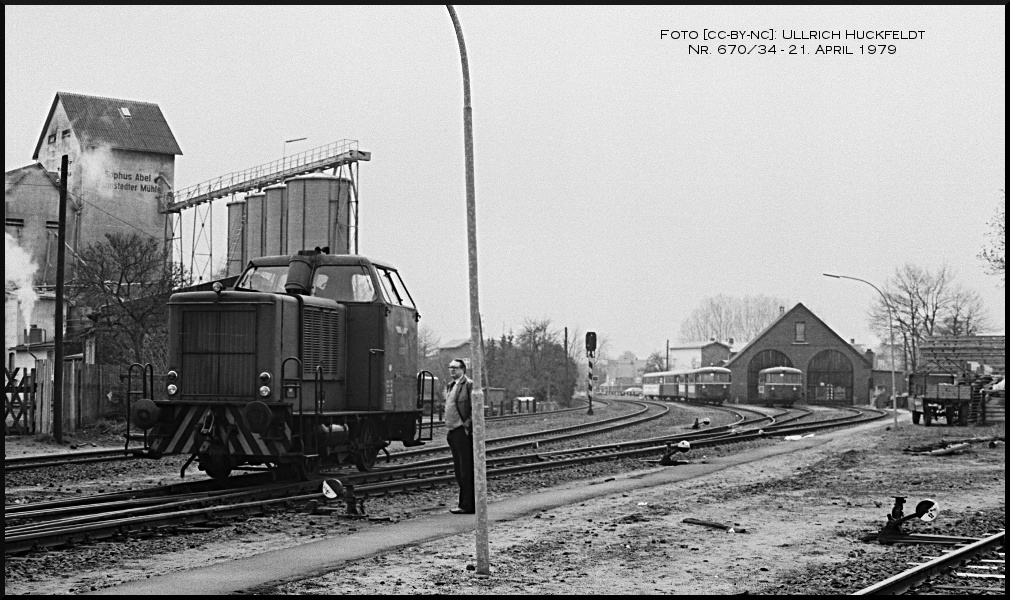 V 3.024 rangiert im Bf Barmstedt am 21. April 1979. Im Hintergrund das Bw Barmstedt mit Lokschuppen und Uerdinger Triebwagen. Aufnahme von Ullrich Huckfeldt.