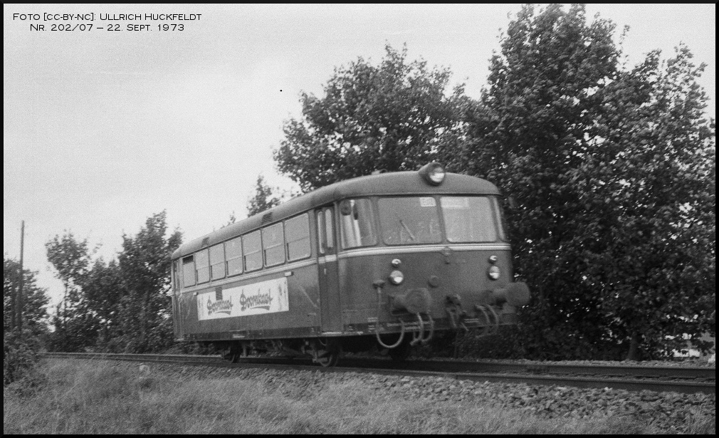 Uerdinger Triebwagen VT 3.09 der EBOE bei der Ausfahrt aus Ulzburg am 22. September 1973.