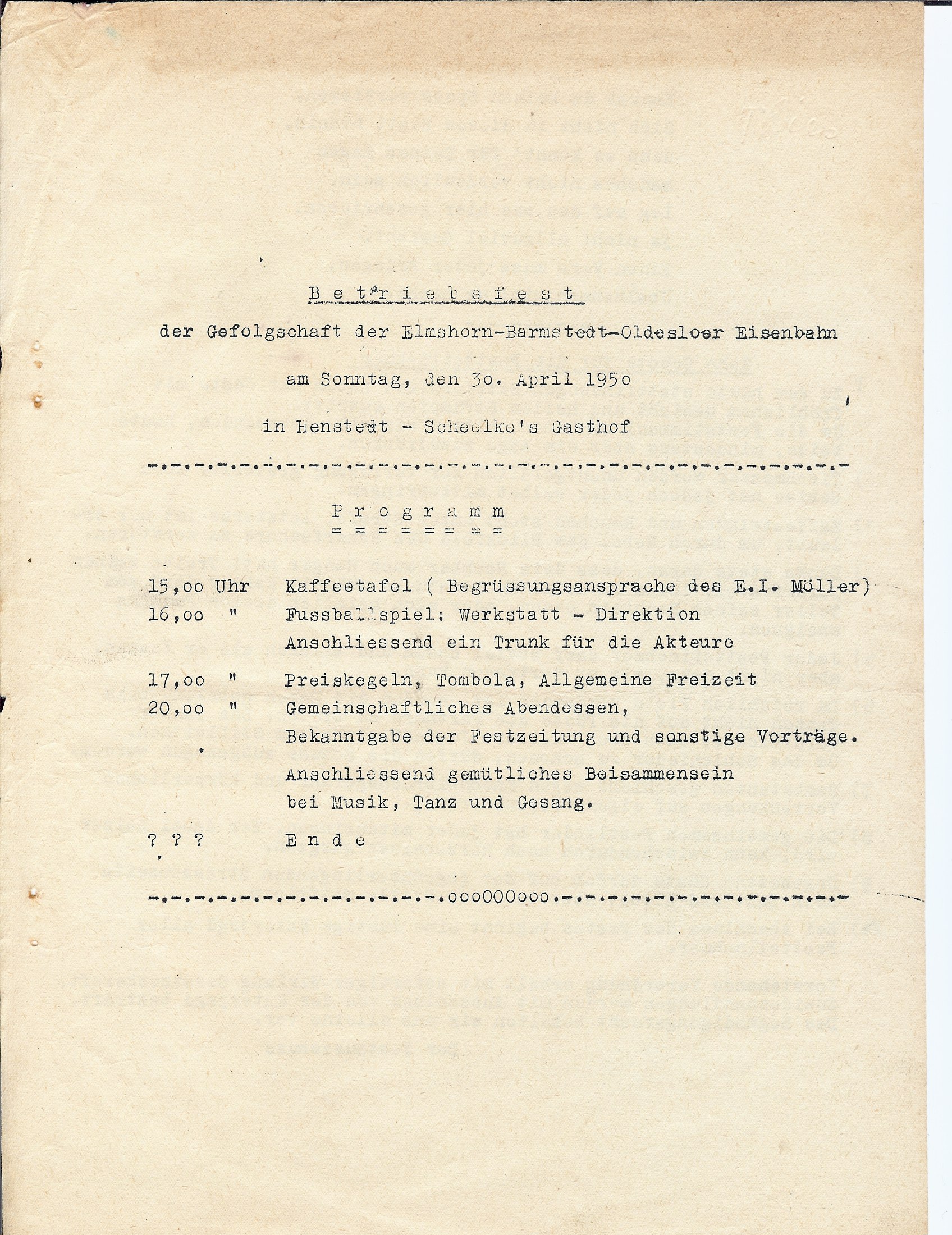 Am 30. April 1950 fand in Henstedt ein Betriebsfest der EBOE statt. Diese Seiten zeigen die Festschrift dieses Betriebsfestes.