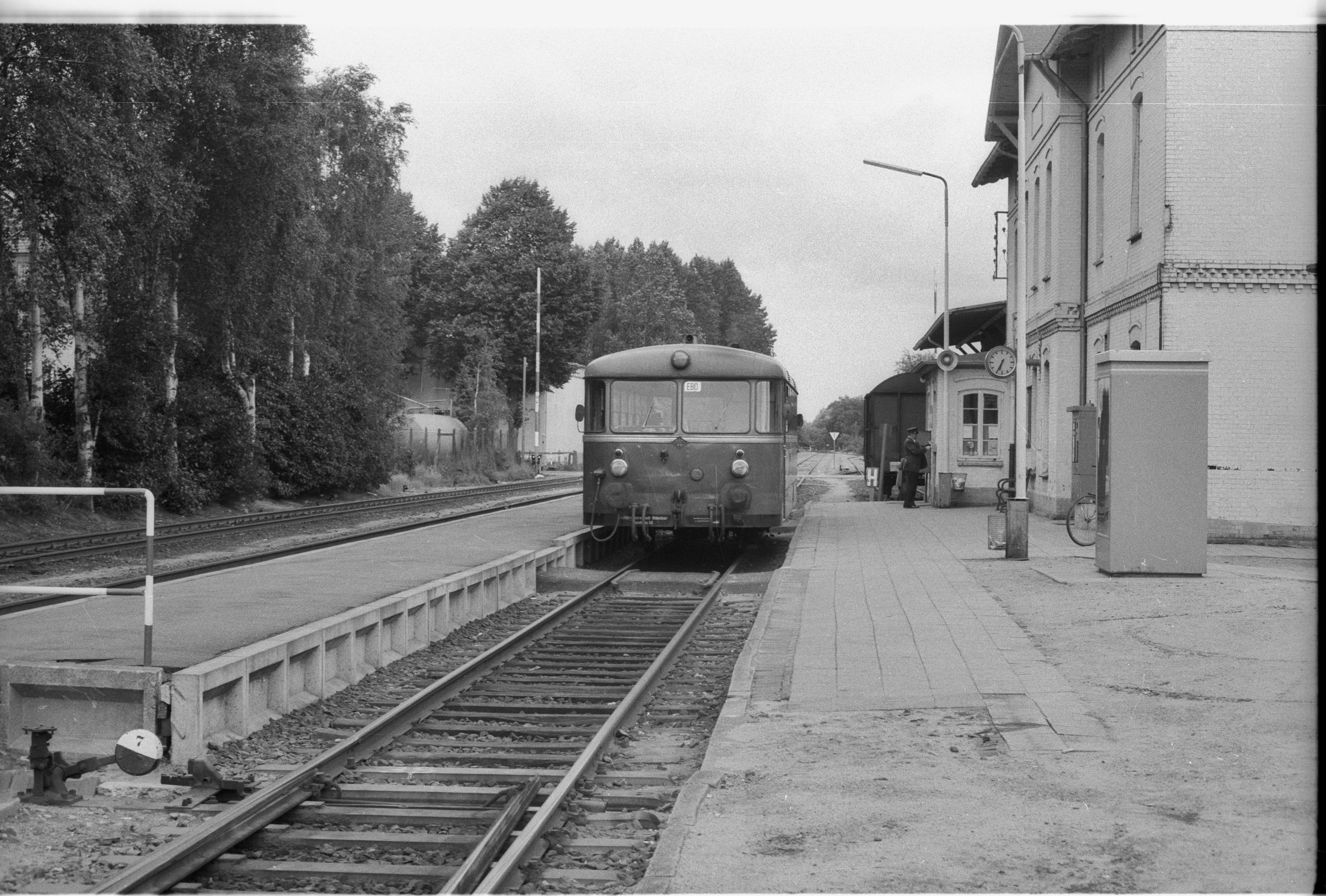 Dieses Bild zeigt den Bahnhof Barmstedt mit dem Uerdinger Schienenbus VT 3.10 auf Gleis 1. Im Hintergrund stehen Stückgutwagen an der Rampe des Güterschuppens. Das Datum der Aufnahme ist leider nicht bekannt.
