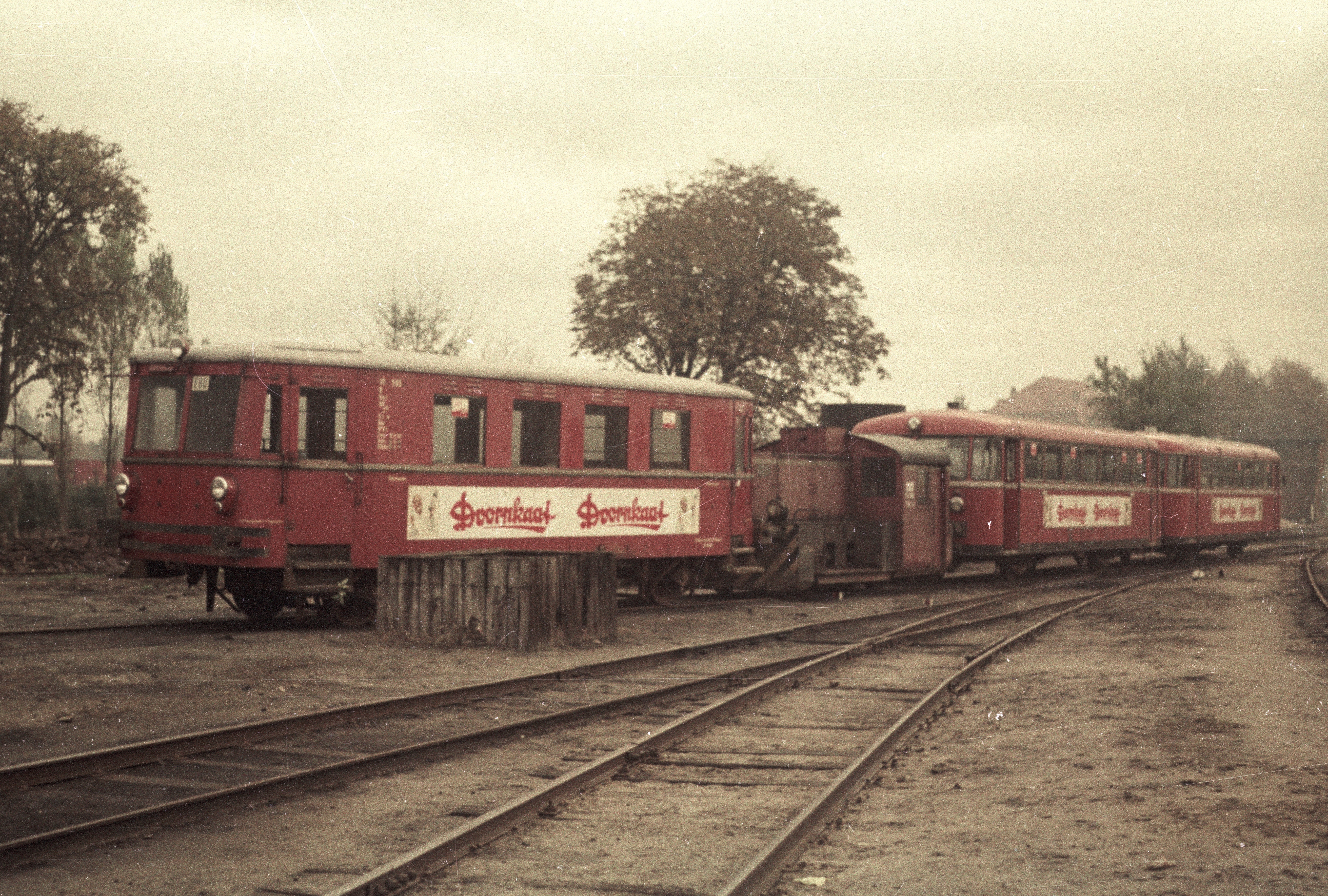 Dieses Bild zeigt eine Garnitur Uerdinger Schienenbusse beim Verschieben der bereits abgestellten Fahrzeuge T3 und V3.021 im Jahre 1968.