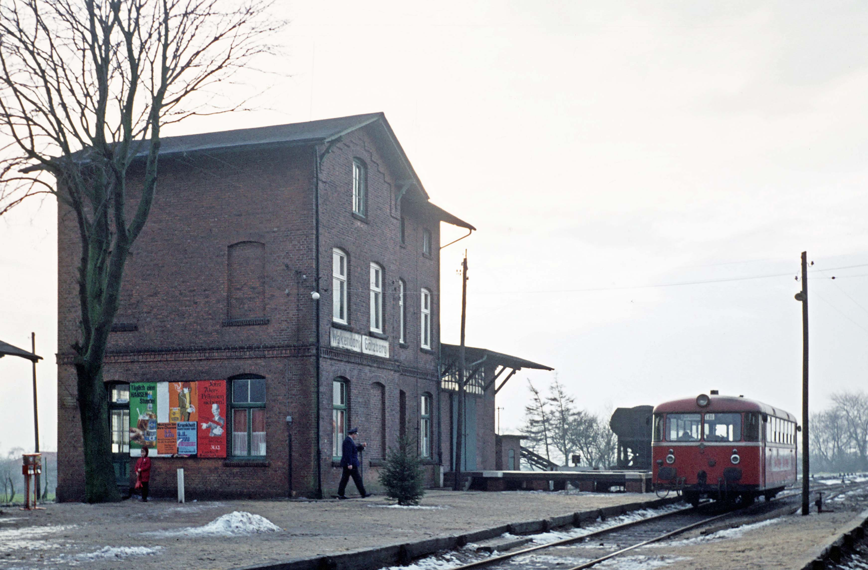 Hier sehen wir den Triebwagen VT 3.09 vor dem Empfangsgebäude des Bf Wakendorf-Götzberg im Januar 1971. Der Autor der Aufnahme ist Ernst-Günter Lichte.