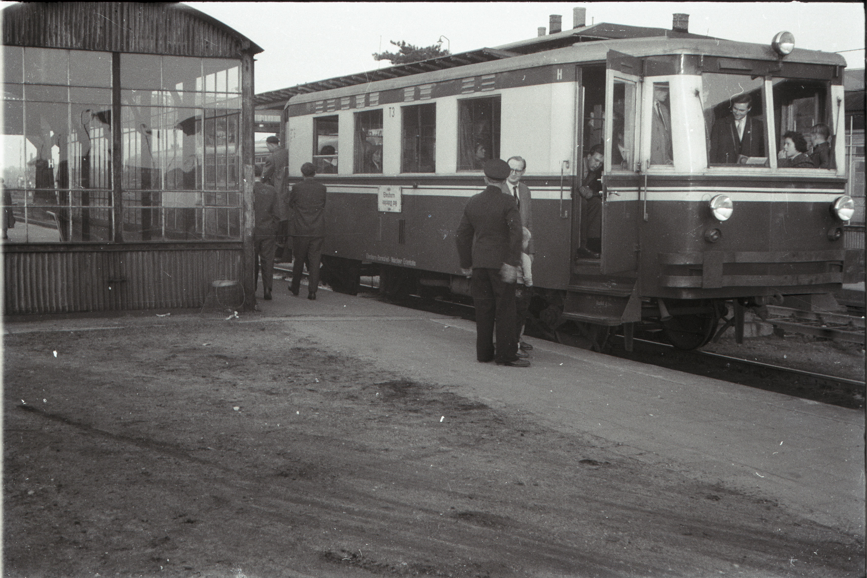 Auf diesem Bild sehen wir den Gotha Triebwagen T3 im Bf Oldesloe. Zahlreiche Fahrgäste warten auf die Abfahrt in Richtung Ulzburg. Das Datum der Aufnahme ist unbekannt. Die Aufnahme stammt von Manfred Hohmann.
