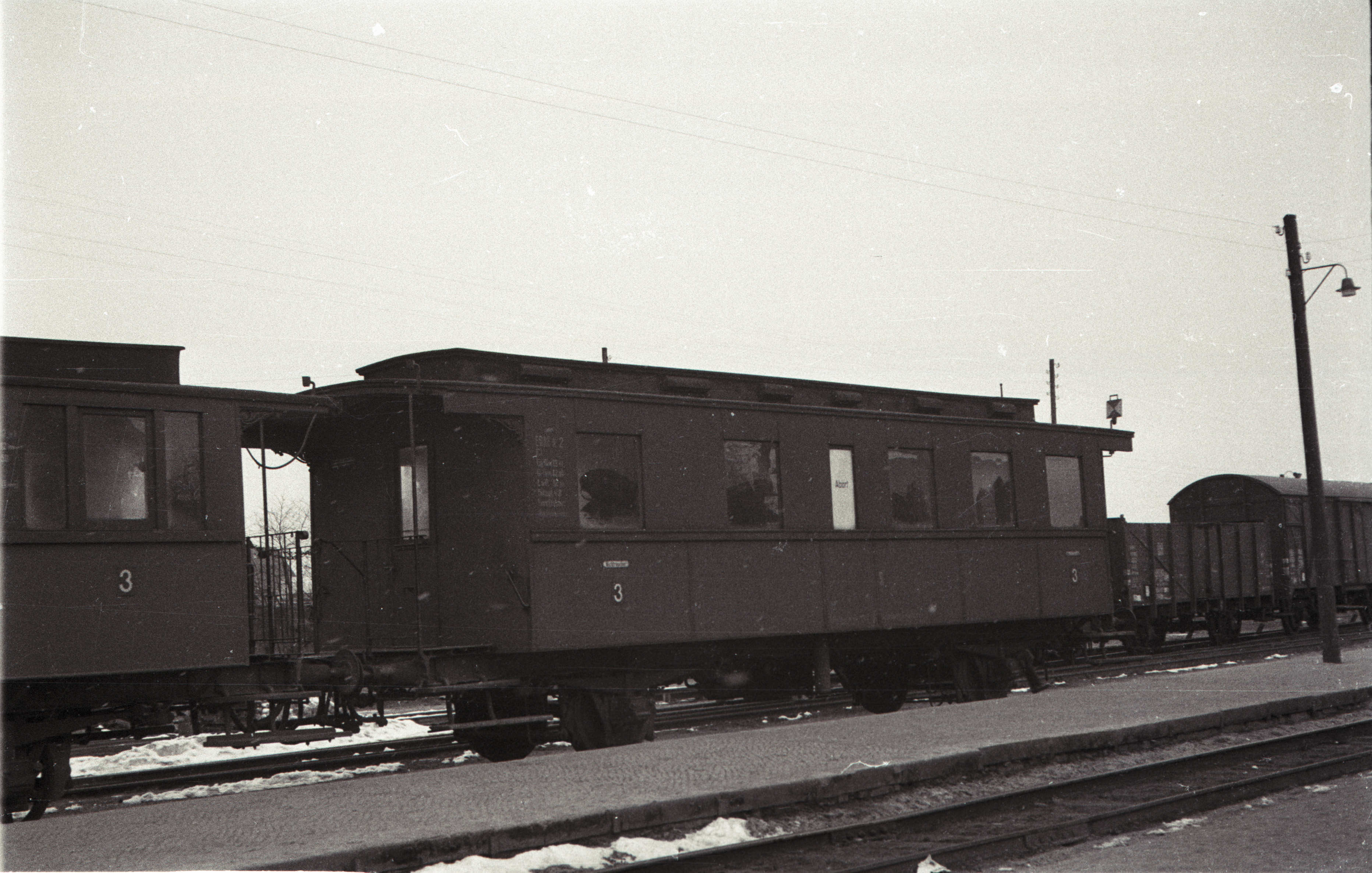 Der Donderzug der Freunde der Eisenbahn beim Halt in Ulzburg. Im Bild zu sehen die beiden Personenwagen. Rechts im Bild Wagen 2 und links teilweise im Bild Wagen 4. Das Bild von Manfred Hohmann entstand am 9. März 1958.