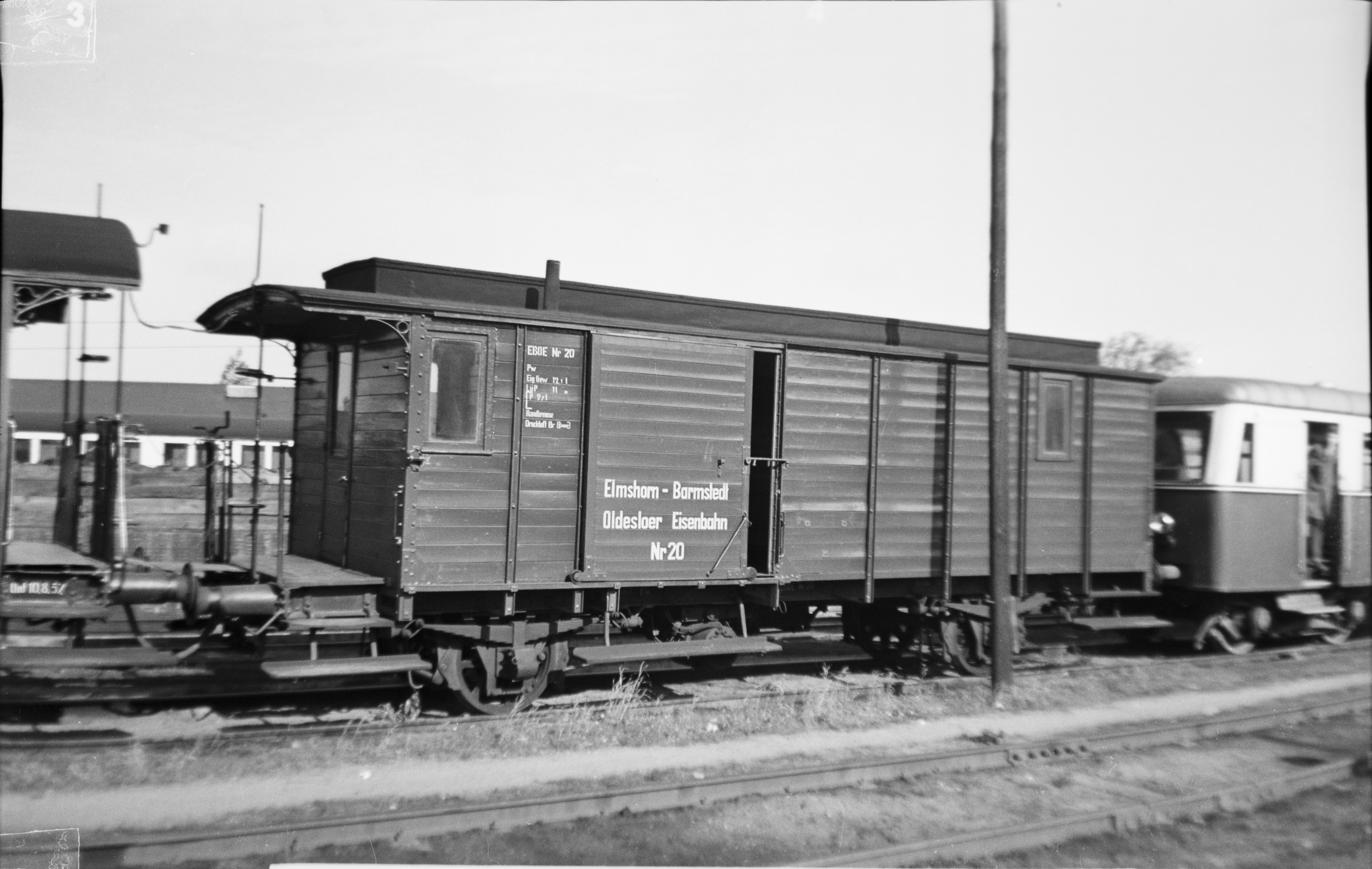 Dieses Bild passt zu einer Reihe weiterer Bilder aus dem Jahre 1958. Die Bilderserie zeigt die abgestellten Triebwagen, Packwagen und Personenwagen im Jahre 1958 neben dem Lokschuppen des Bw Barmstedt. Hier sehen wir den Packwagen Pwi20, dahinter einen Teil des MAN Triebwagens T5. Aufnahme von Manfred Hohmann.