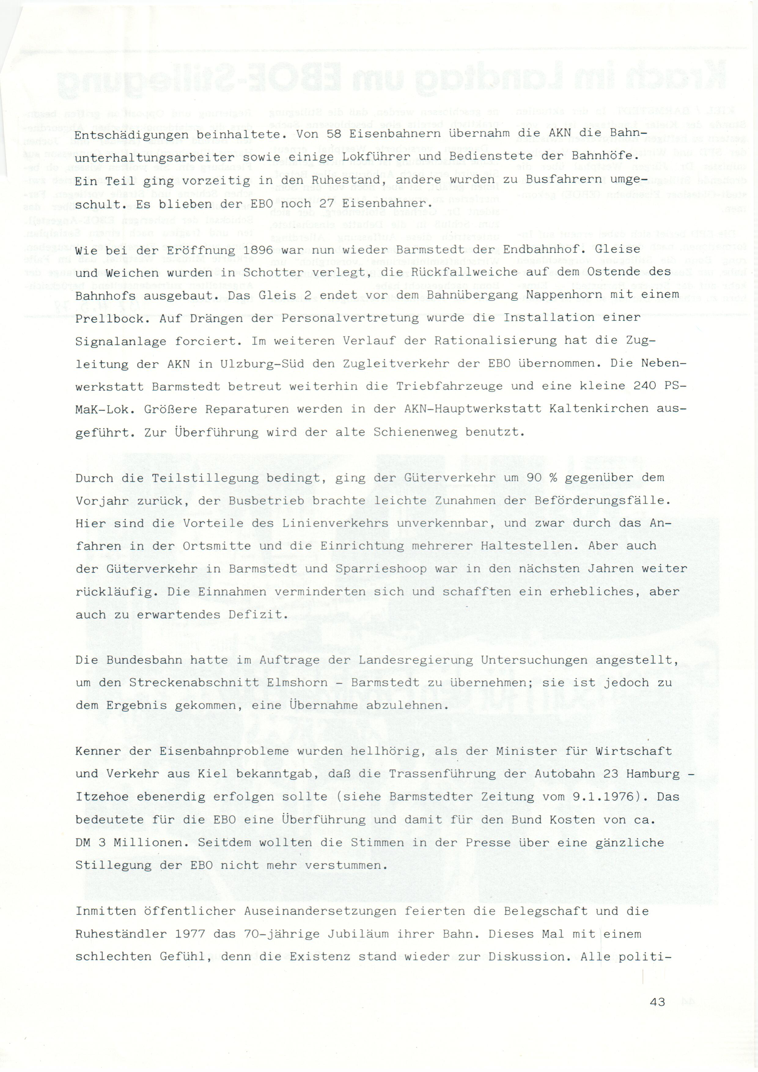 Im Jahre 1981 übernahm die AKN die EBOE und die Alsternordbahn, so dass ab diesem Zeitpunkt alle drei Bahnen unter dem Dach der AKN betrieben wurden. Anlässlich dieser Fusion erschien die vom Kameradschaftswerk der EBO herausgegebene Festschrift mit dem Titel "Die Geschichte der EBO-Eisenbahn".