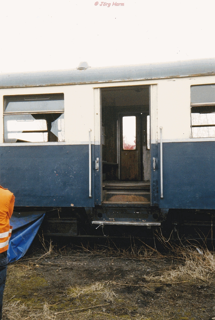 Nachdem der Ringlokschuppen des Bw Wilhelmsburg durch Brandstiftung am 15. Oktober 1994 komplett zerstört wurde, endeten die Träume von einem großen Eisenbahnmuseum in Hamburg Wilhelmsburg. Der VT 3.04 der EBOE hat durch das Feuer zwar kein Schaden genommen, aber im Jahre 1999 steht er auch 5 Jahre nach dem Brand abgestellt in Hmb Wilhelmsburg. Diese Aufnahme zeigt einen der beiden Einstiege des VT 3.04. Der Zustand ist bereits desolat und der Triebwagen ist Wind und Wetter ausgesetzt. Er sieht einer ungewisser Zukunft entgegen. Foto von Tanja Harm.