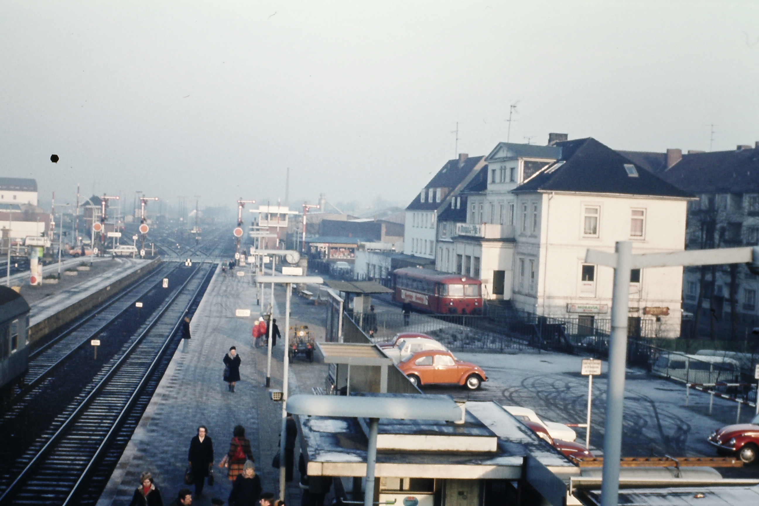 Blick von der Brücke über die Gleise 1 bis 3 des Elmshorner Bahnhofs in richtung Norden. Hinter dem Parkplatz steht der VT 3.09 der EBOE auf Gleis 1a und wartet auf die Abfahrt in Richtung Barmstedt. Das Ausfahrtsignal zeigt noch "Halt". Aufnahme von Claus HANACK.