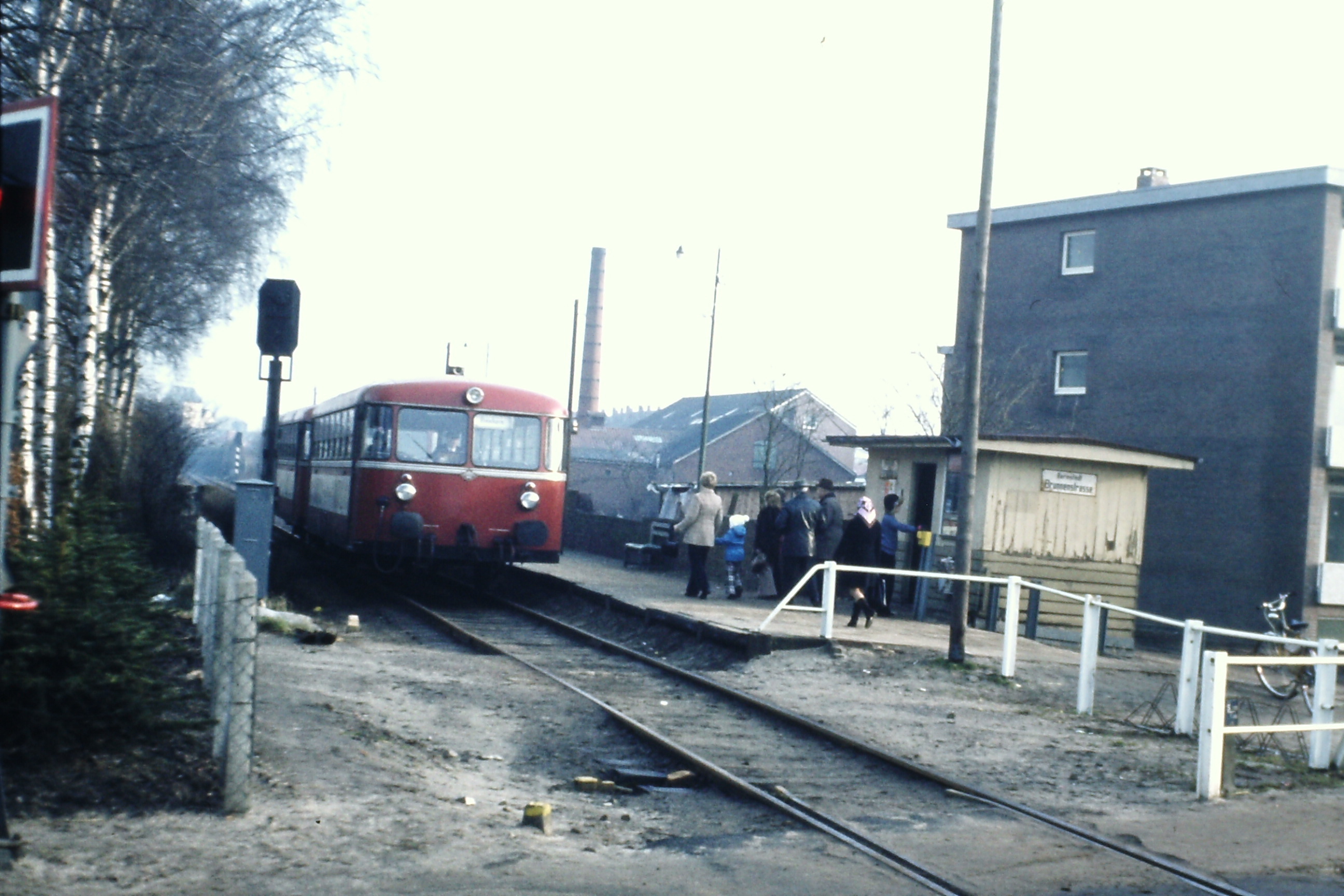 Nur wenige Hundertmeter hinter dem Bf Barmstedt in Richtung Westen erreicht am 5. Januar 1974 der Zug den Hp Brunnenstraße. Damit ist Barmstedt der einizige Ort an der EBOE Trasse, der zwei Haltestellen besitzt. Aufnahme von Claus HANACK.