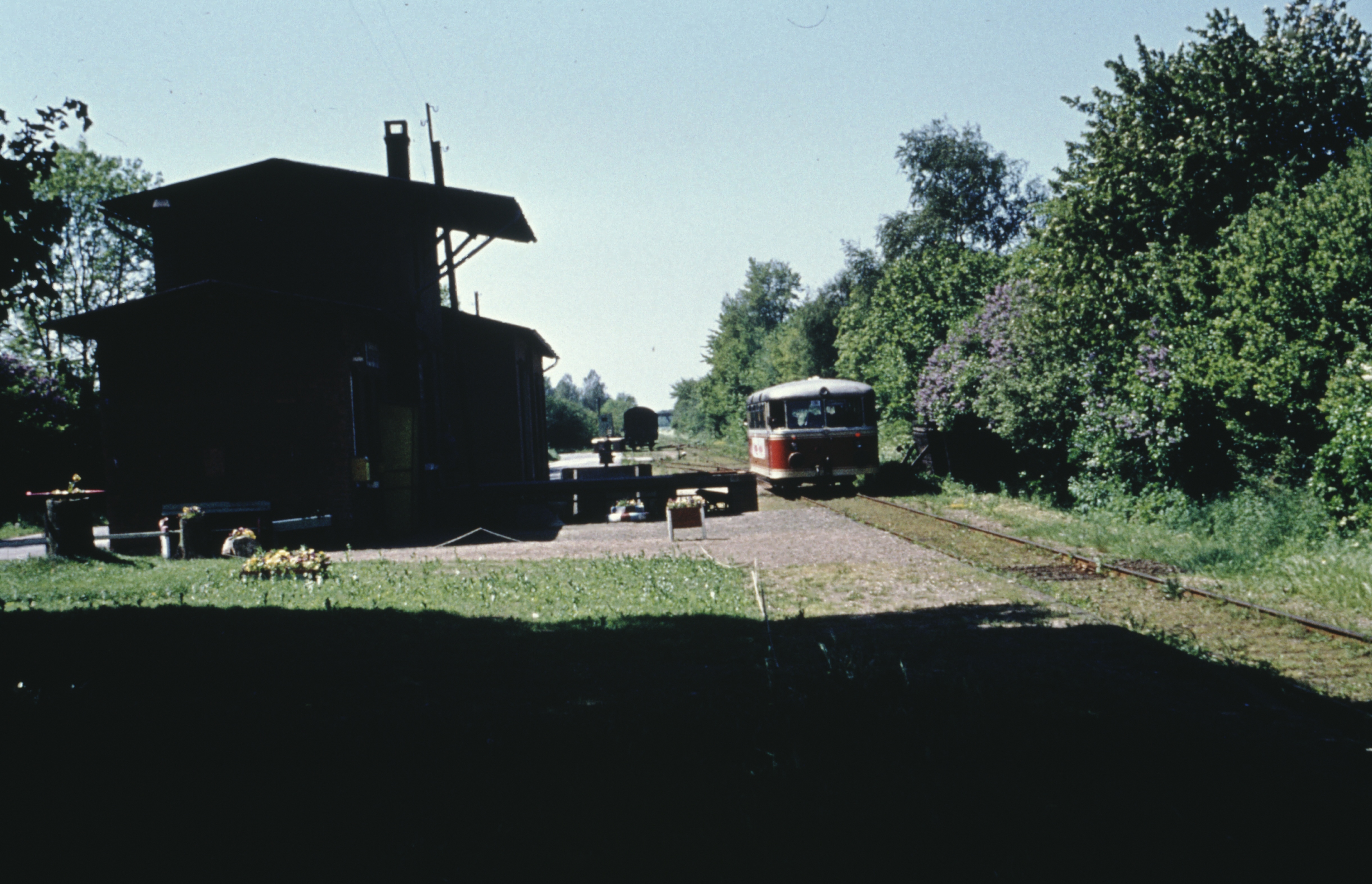 Der Triebwagen VT 3.11' hält auf der Fahrt von Bad Oldesloe nach Westen im Bf Blumendorf. Gut zu erkennen ist auch hier der Schienenstoß in Schotterbettung während der Rest der Schienen noch in Sandbettung liegt. Im Hintergrund ist die Brücke über die Bundesstraße 404 bzw. die Autobahn A21 zu sehen. Links hinter dem Empfangsgebäude steht ein Güterwagen an der Laderampe. Das Datum der Aufnahme ist nicht bekannt. Da der Triebwagen erst im Juni 1970 zur EBOE kam, ist die Aufnahme vermutlich im Sommer 1970 entstanden bevor der VT seine weinrote Lackierung bekam. Slg Jens Heinitz