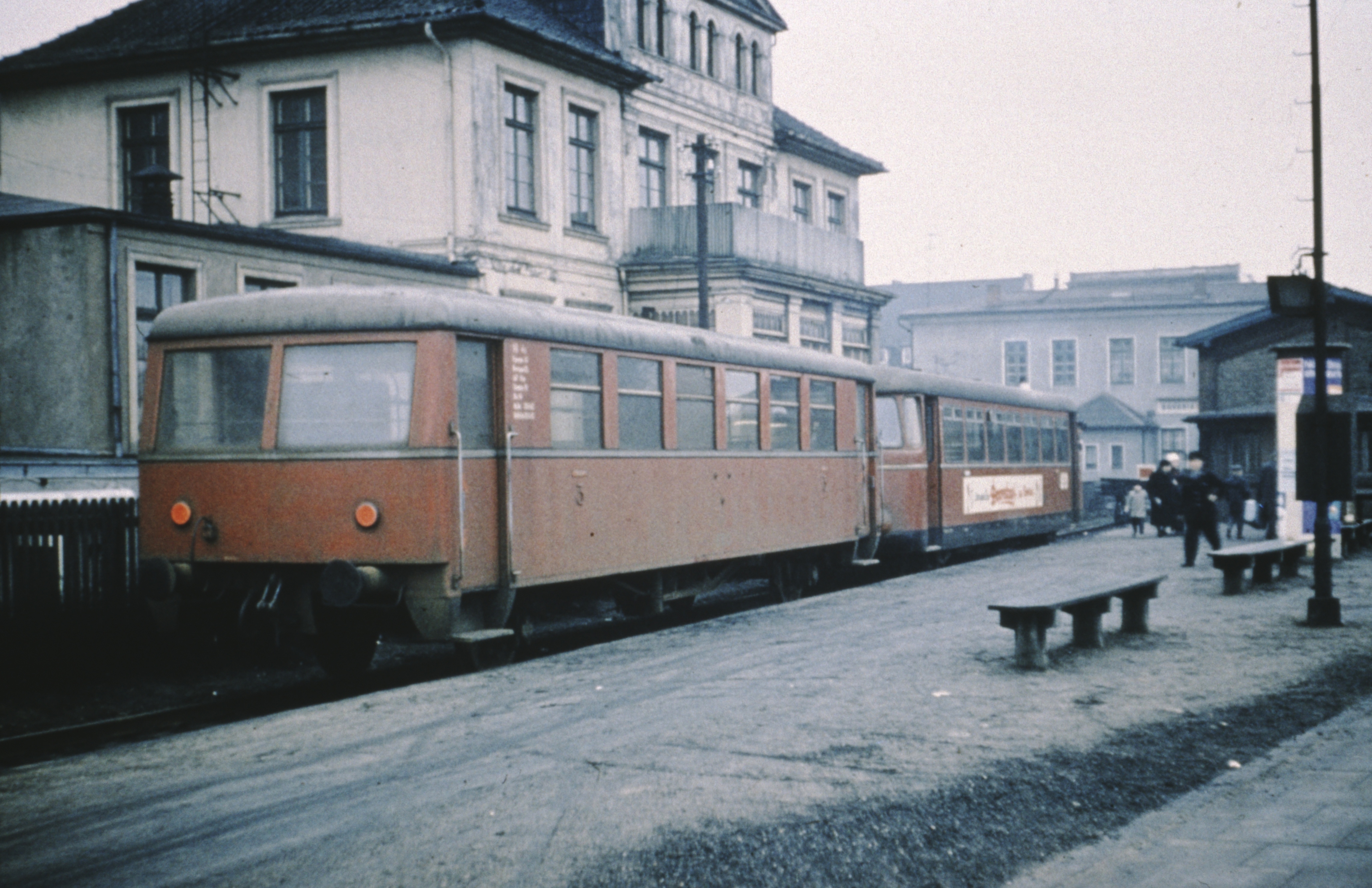 Der MAN Triebwagen VT 3.06 steht im Bf Elmshorn zusammen mit dem Steuerwagen VB 3082 am Keilbahnsteig Gleis 1a vor dem Direktionsgebäude der EBOE.