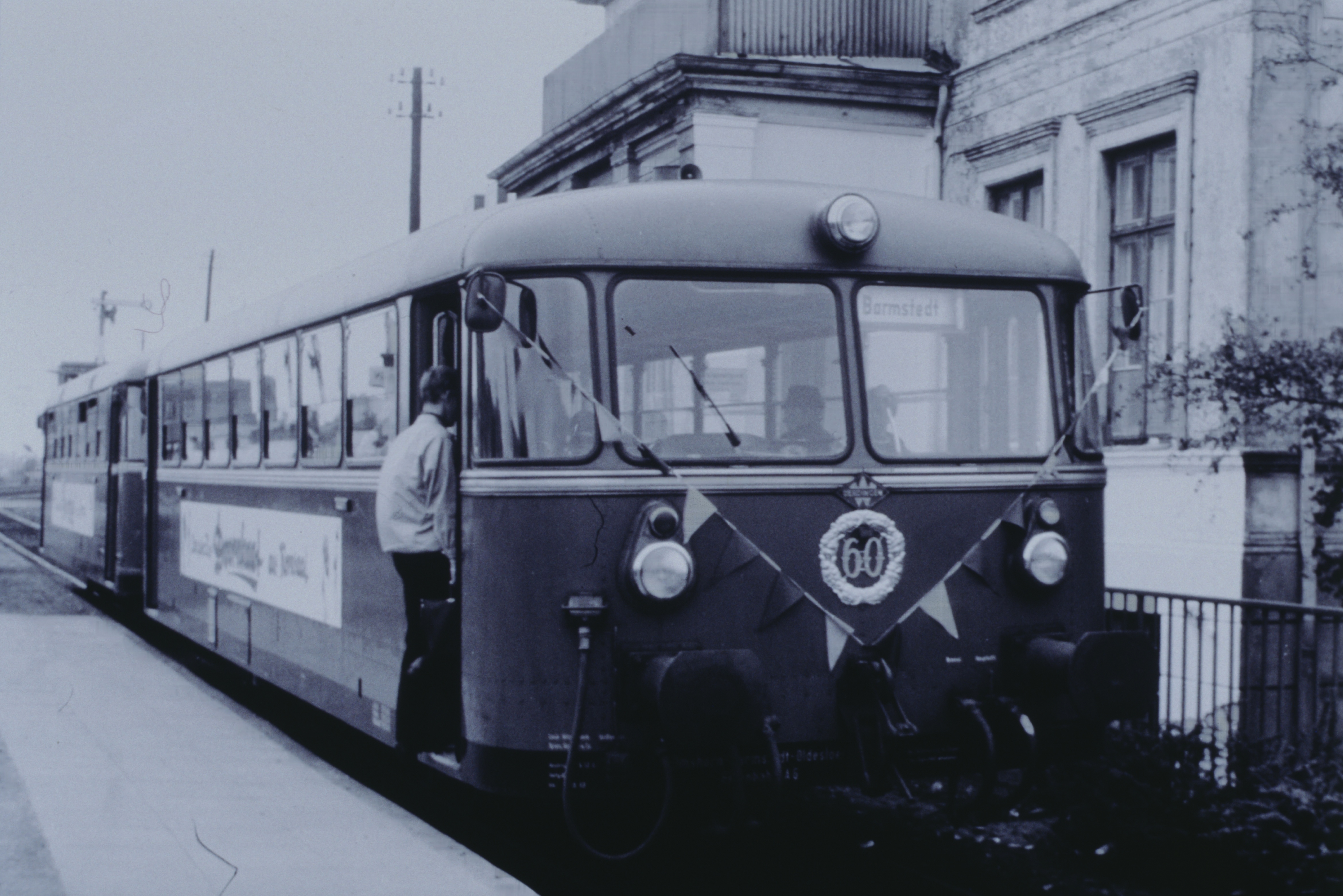 Jubiläumszug zum 60. Geburtstag der EBOE am 9. Juni 1967 in Elmshorn auf Gleis 1a. Vorne der Steuerwagen VS 3.51, zu erkennen an den oben montierten Spiegeln. Welcher VT im Hintergrund steht, lässt sich nicht erkennen. Bei dem Gebäude rechts im Bild handelt es sich um das ehemalige Direktionsgebäude der EBOE. Dieses wurde nach dem Zusammenschluß mit der AKN Ende der 1950er Jahre aufgegeben.