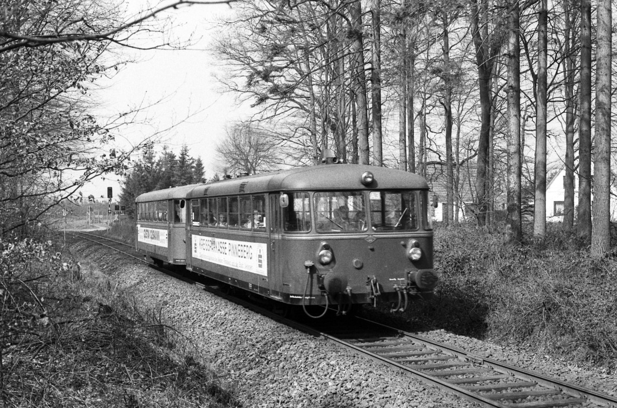 Der Zug bestehend aus VT 3.08 und VS 3.52 kurz nach dem Überqueren des Bü Am Reihergehölz zwischen Vossloch und dem Hp Brunnenstraße am 21. April 1984.