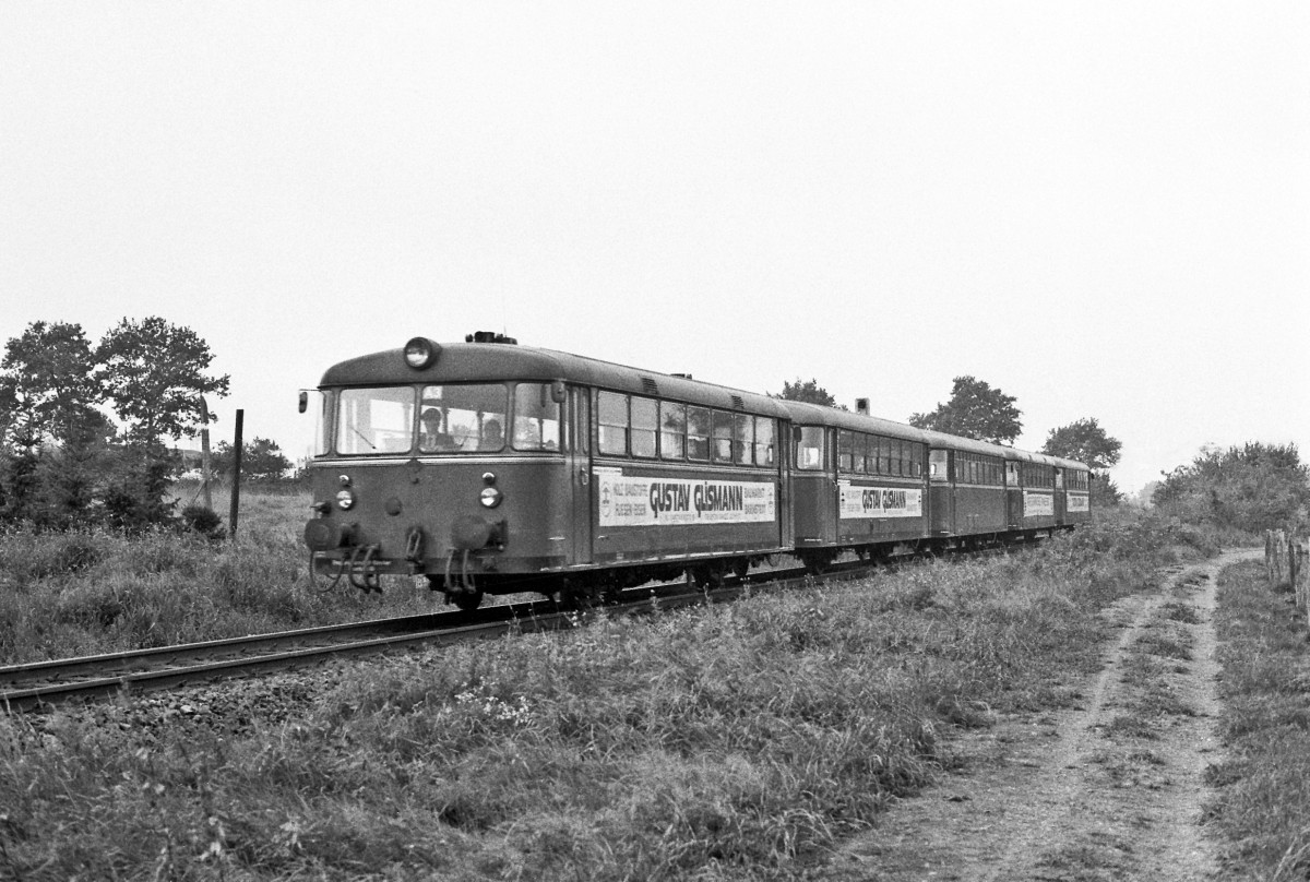 EBOE 11 Schülerzug bestehend aus VT3.09 VS3.52 VM3.90 VT3.08 VS3.51 zwischen Bokholt Voßloch 31-Aug-1984 Dieter Riehemann