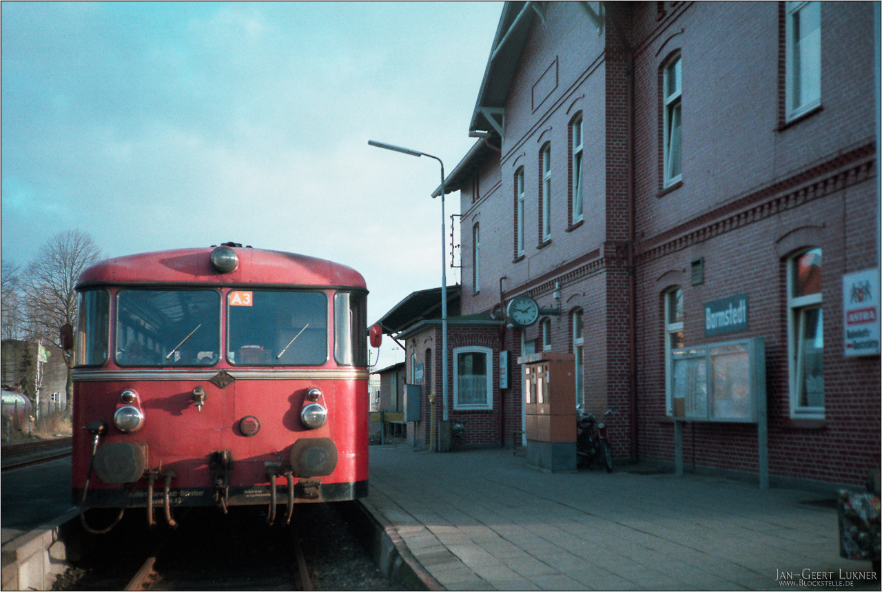 06.12.1986: Mit diesen Bildern zeige ich nun mal einige meiner allerersten Bilder, Filmtüte Nr 11 war das; davor kommen praktisch nur Familienbilder... Im zarten Alter von 15 Jahren gab es zwei Schnappschüsse vom Umsteigen oder von der Wende in Barmstedt. Der Bahnhof hatte ein hübsches Empfangsgebäude und war noch ein lebendiger Kleinstadtbahnhof. Aufgrund der Lage dürfte die Gleisseite des Gebäudes nur im Hochsommer in die Sonne kommen.Der Triebwagen zeigt noch die Eigentümeraufschrift "Elmshorn-Barmstedt-Oldesloer Eisenbahn AG"