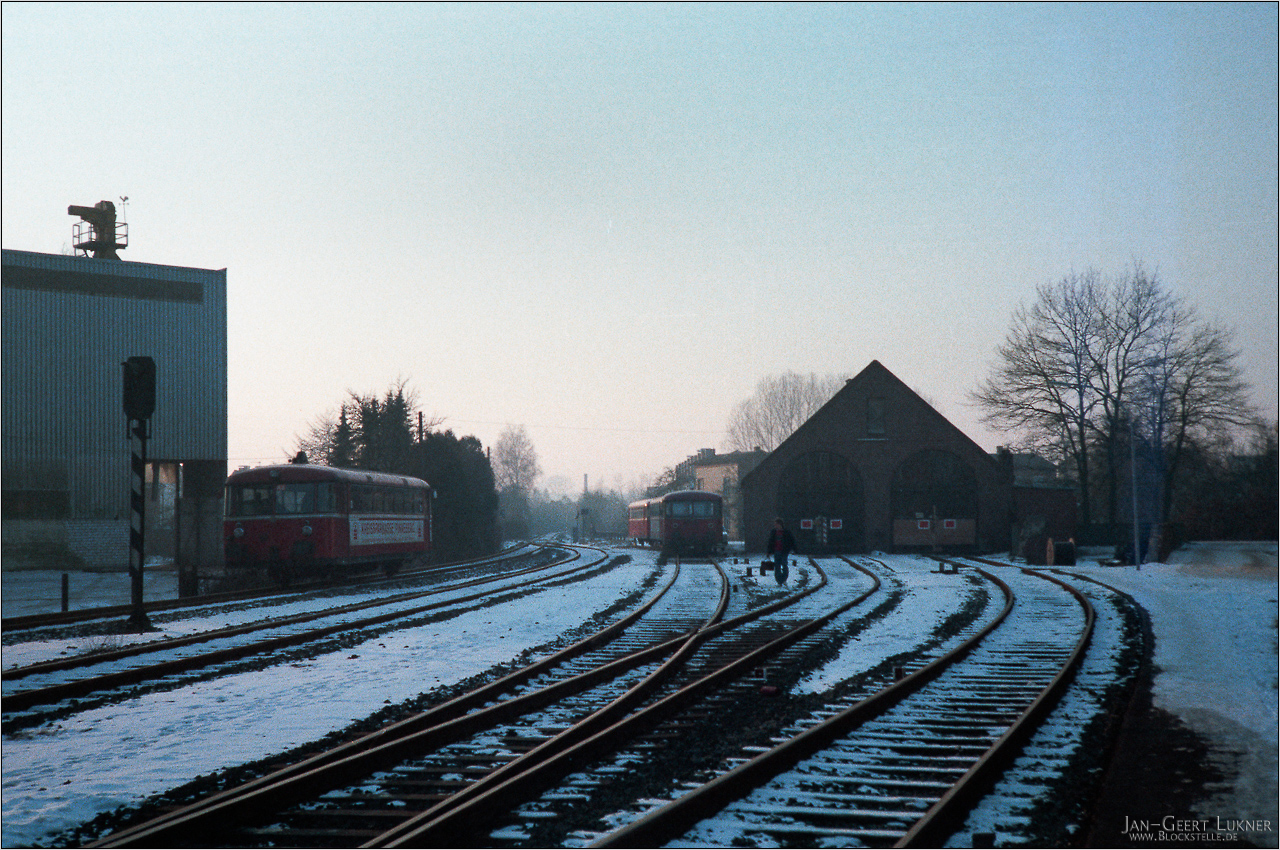 Schön ist die Werkstatt der EBOE (nunmehr nur Betriebsteil der AKN) zu erkennen. Der Tag geht zur Neige, der Takt wird ausgedünnt und vermutlich kommt da gerade ein Tf auf dem Weg in den Feierabend entgegen.