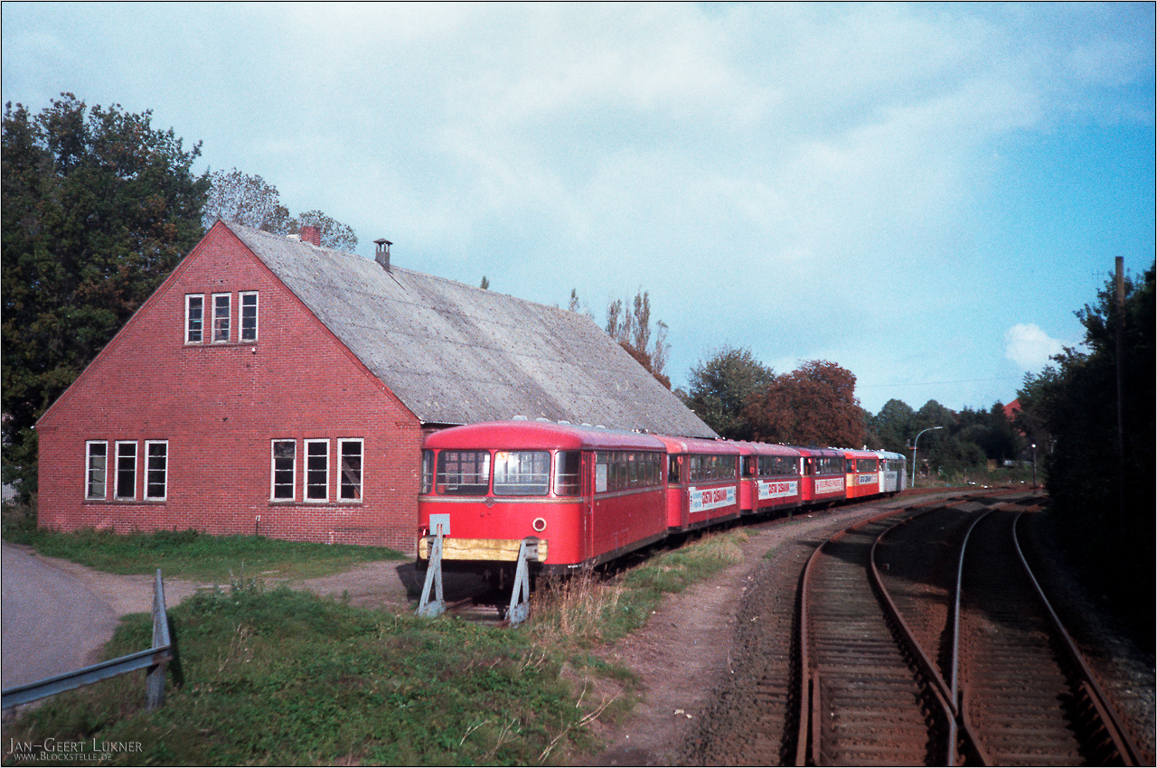 Die meisten Touren unternahmen wir hier natürlich am Wochenende, wo nur ein einzelner Triebwagen im Einsatz war. Da war in Barmstedt dann immer die Kette der übrigen Fahrzeuge interessant, die markant neben der Werkstatt aufgereiht war. Ganz vorn am Bock stand der einzige Beiwagen (Steuerwagen?), den ich nie im Einsatz erlebt habe. Bei Mehrteilern habe ich immer nur mehrere Motorwagen erlebt.