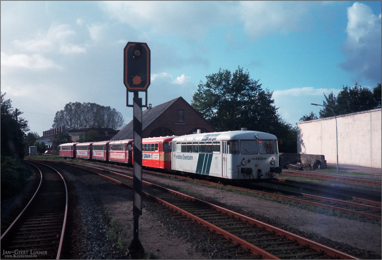 27.09.1987: Das Bild der A3 wurde bunter. Man hatte angefangen, erste Schienenbusse in den orange-gelben Farbtopf der AKN zu werfen. Wieder mal entstanden einige Bilder in Barmstedt, zwei davon ganz billig aus dem Zug. Offenbar habe ich am Fotografieren Spaß gefunden, so sind wir schon bei Filmnummer 37!Und von der anderen Seite. Vermutlich wegen des "Verschönerungsprogramms" der VTs hatte die AKN den "Erlebte Eisenbahn"-Schienenbus 798 677 von der DB übernommen. Mit dem weißen Triebwagen hatte die DB zuvor Bereisungsfahrten auf der Neubaustrecke durchgeführt. Ursprünglich stammt die Lackierung aber von den 150 Jahr-Feiern in Nürnberg.