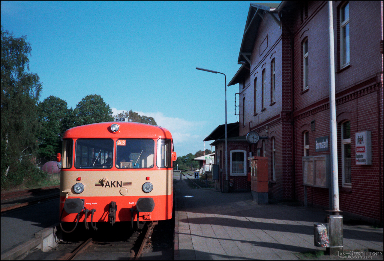 27.09.1987: Das Bild der A3 wurde bunter. Man hatte angefangen, erste Schienenbusse in den orange-gelben Farbtopf der AKN zu werfen. Wieder mal entstanden einige Bilder in Barmstedt, zwei davon ganz billig aus dem Zug. Offenbar habe ich am Fotografieren Spaß gefunden, so sind wir schon bei Filmnummer 37!Zwischendurch gab es die klassische Stand-Aufnahme am Bahnsteig. Auch wenn mir die Lampe offensichtlich ziemlich im Weg stand, so konnten wir doch froh sein, dass das Züglein nicht ganz in den Schatten des EG gerollt war.