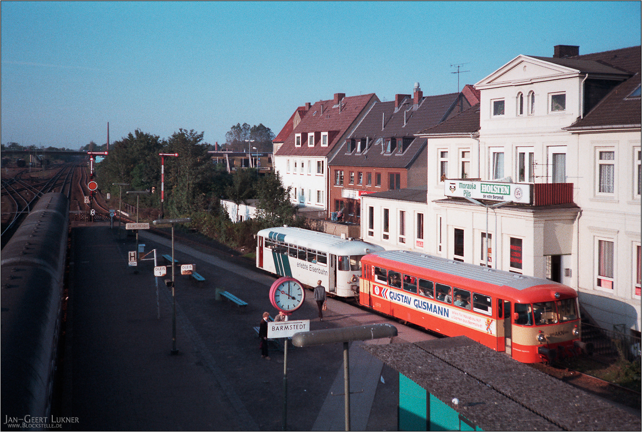 29.09.1987: Aus irgendeinem Grunde waren wir schon wieder da, in Elmshorn. Nicht, dass da etwa auf der DB Seite brauchbarere Aufnahmen zustande gekommen wären; keine Ahnung, was wir da wollten. Vielleicht nur mal im Imbiss Pommes für 1 DM abgreifen; ja, als Schüler fuhr man auch für sowas einmal quer durch Hamburg. Das entstandene Bild ist das einzige, das ich je aus der Perspektive gemacht habe...Tja, warum hat man aus dieser Perspektive nicht mal einen einfahrenden VT mit den Formsignalen und ohne störenden Zug auf Gleis 1 gemacht? Somit musste halt dieses Bild gescannt werden - trotz in den Zug ragender Hütte usw. Immerhin gab es hier mal den "Erlebte Eisenbahn"-Schienenbus im Einsatz.