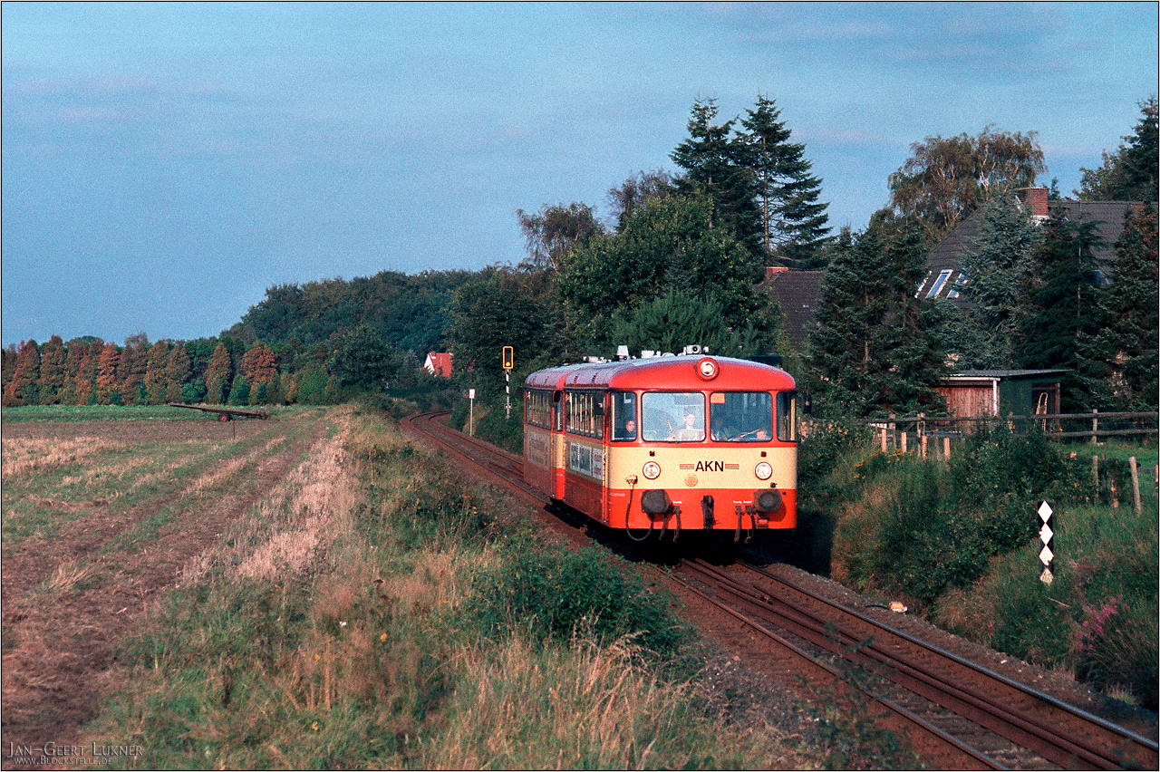 07.09.1993: Jahrelang hat man sich um die "EBOE" nicht gekümmert. Man fängt immer erst an, wenn irgendwas zuende geht. Nun ging es mit den Schienenbussen zuende. Die AKN hatte neue VTA beschafft und konnte damit VT2E für die A3 freisetzen. Also gab es mal wieder eine Tour dorthin. Und auch wenn man es nicht allen Bildern ansieht, ja, es war eine gezielte Fototour. Warum die nur nachmittags stattfand, als das Licht fast überall an der A3 arg spitz stand - ich habe keine Ahnung. Aber paar Andenkenaufnahmen, die ich heute nicht missen möchte, sind doch zustande gekommen. Dabei hatte ich mich mit dem Zug ostwärts bewegt. Erst Sparrieshoop, dann Voßloch, dann Barmstedt. Denn es gab ein Novum, eine Strecken-Wiedereröffnung: Mit ganzen drei Zugpaaren an Mo-Fr bzw einem Paar an Sa wurde jetzt wieder der Abschnitt Barmstedt - Ulzburg befahren. Die Fahrten dienten einzig und allein der Anbindung der Fahrzeuge an die Werkstatt in Kaltenkirchen, da die EBOE-Werkstatt in Barmstedt geschlossen worden war. Sie waren allerdings als Fußnote unter der Fahrplantabelle 139 (Elmshorn - Barmstedt) veröffentlicht und konnten zur Mitfahrt genutzt werden.Während der Lichtstand in Sparrieshoop langsam in die Achse wanderte, war es in Voßloch schon rum. Deshalb war ich mit einem der nächsten Züge dorthin gefahren. Es war ein Werktag mit Zweizugbetrieb und zweiteiligen VT-Garnituren.