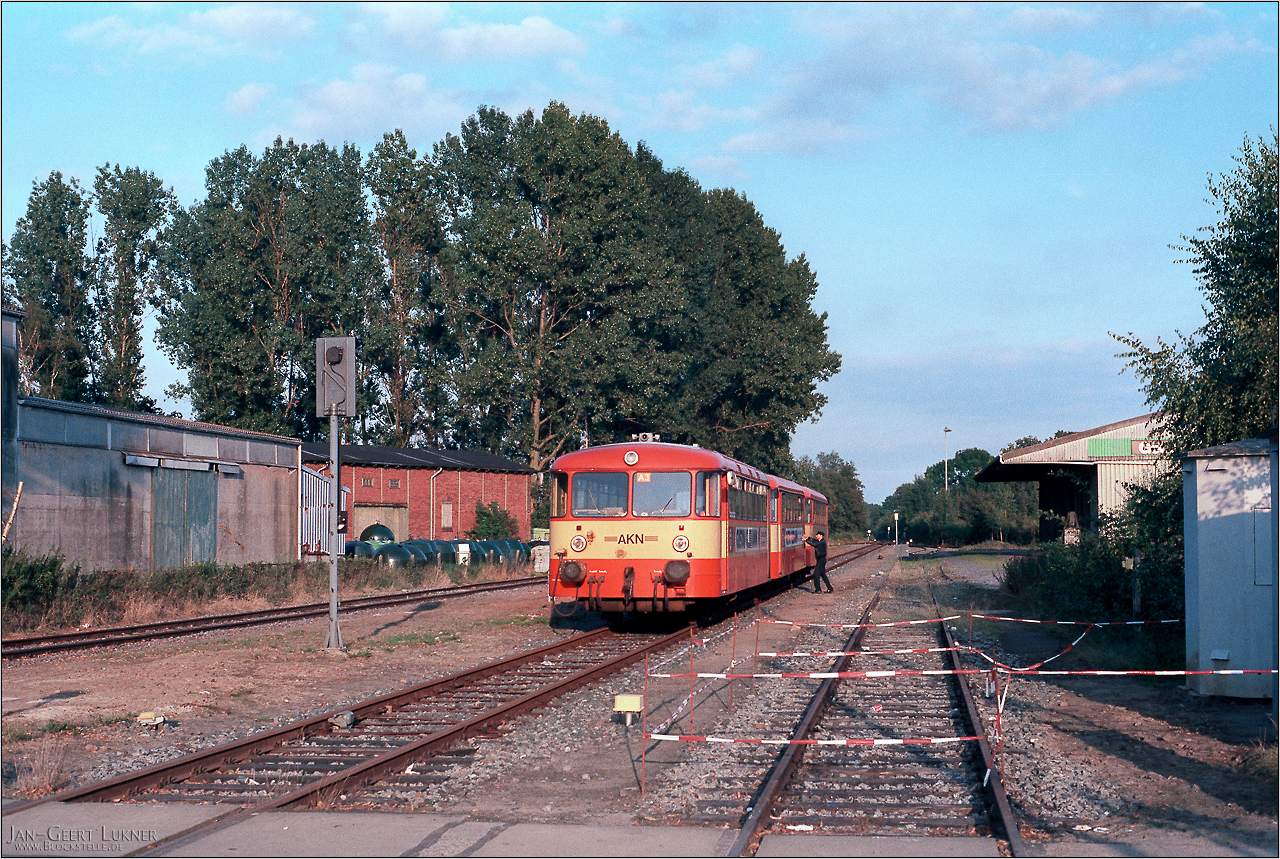 07.09.1993: Jahrelang hat man sich um die "EBOE" nicht gekümmert. Man fängt immer erst an, wenn irgendwas zuende geht. Nun ging es mit den Schienenbussen zuende. Die AKN hatte neue VTA beschafft und konnte damit VT2E für die A3 freisetzen. Also gab es mal wieder eine Tour dorthin. Und auch wenn man es nicht allen Bildern ansieht, ja, es war eine gezielte Fototour. Warum die nur nachmittags stattfand, als das Licht fast überall an der A3 arg spitz stand - ich habe keine Ahnung. Aber paar Andenkenaufnahmen, die ich heute nicht missen möchte, sind doch zustande gekommen. Dabei hatte ich mich mit dem Zug ostwärts bewegt. Erst Sparrieshoop, dann Voßloch, dann Barmstedt. Denn es gab ein Novum, eine Strecken-Wiedereröffnung: Mit ganzen drei Zugpaaren an Mo-Fr bzw einem Paar an Sa wurde jetzt wieder der Abschnitt Barmstedt - Ulzburg befahren. Die Fahrten dienten einzig und allein der Anbindung der Fahrzeuge an die Werkstatt in Kaltenkirchen, da die EBOE-Werkstatt in Barmstedt geschlossen worden war. Sie waren allerdings als Fußnote unter der Fahrplantabelle 139 (Elmshorn - Barmstedt) veröffentlicht und konnten zur Mitfahrt genutzt werden.Und dann ging es direkt weiter nach Barmstedt. Hier wurde im Ostteil des Bahnhofs offenbar der Abendzug nach Ulzburg - Kaltenkirchen zusammenrangiert. Ein Zug auf dem Streckenabschnitt östlich Barmstedt war nun absolutes Novum, und ich bin schnell gleisparallel in die Richtung gewetzt.