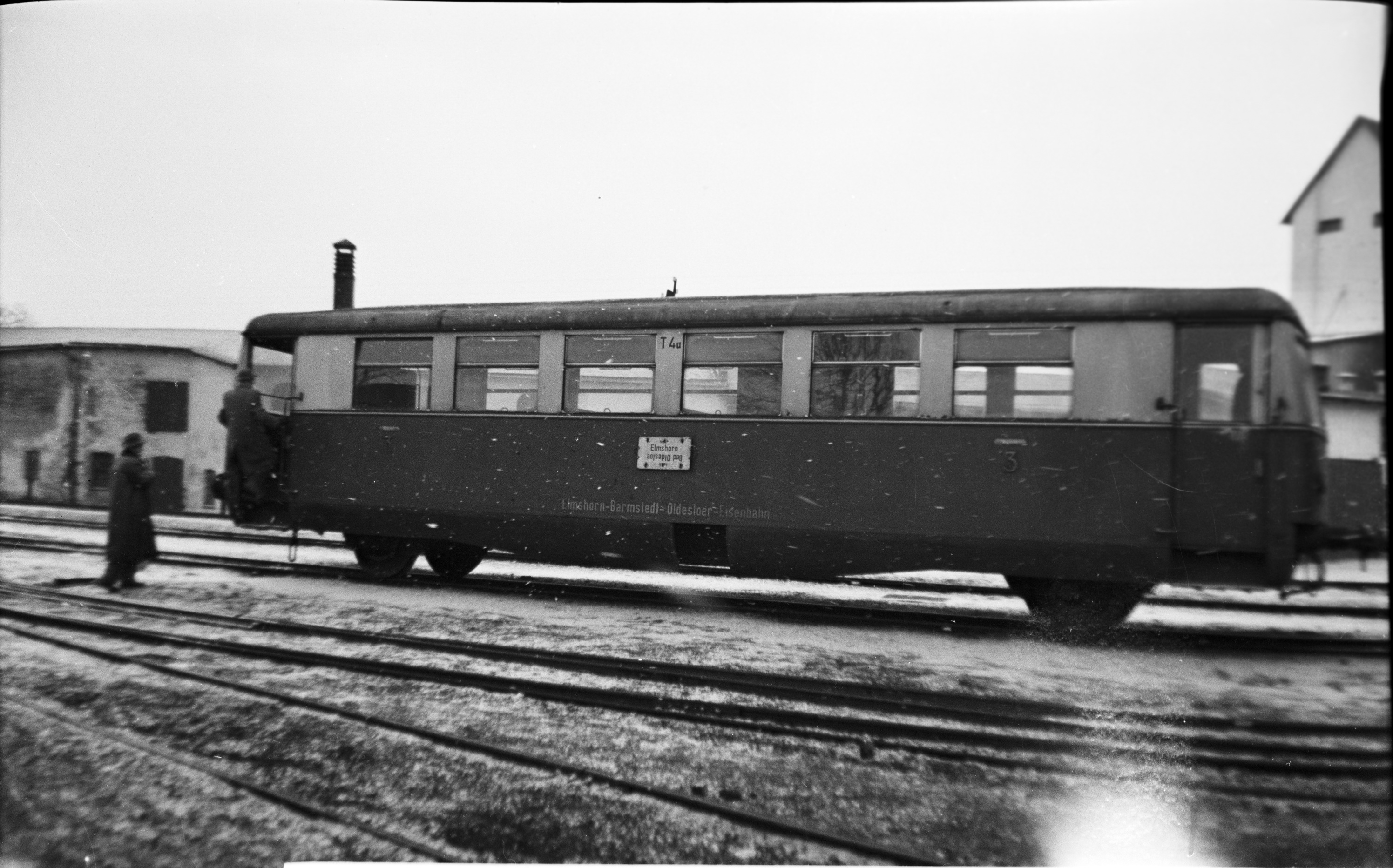 Während eines Aufenthaltes des Sonderzuges der Freunde der Eisenbahn (FdE) am 9. März 1958 in Barmstedt hatten die Fahrgäste die Gelegeheit die Fahrzeuge zu besichtigen. Hier wird der Beiwagen T4a von einigen Personen begutachtet. Aufnahme von Manfred Hohmann.
