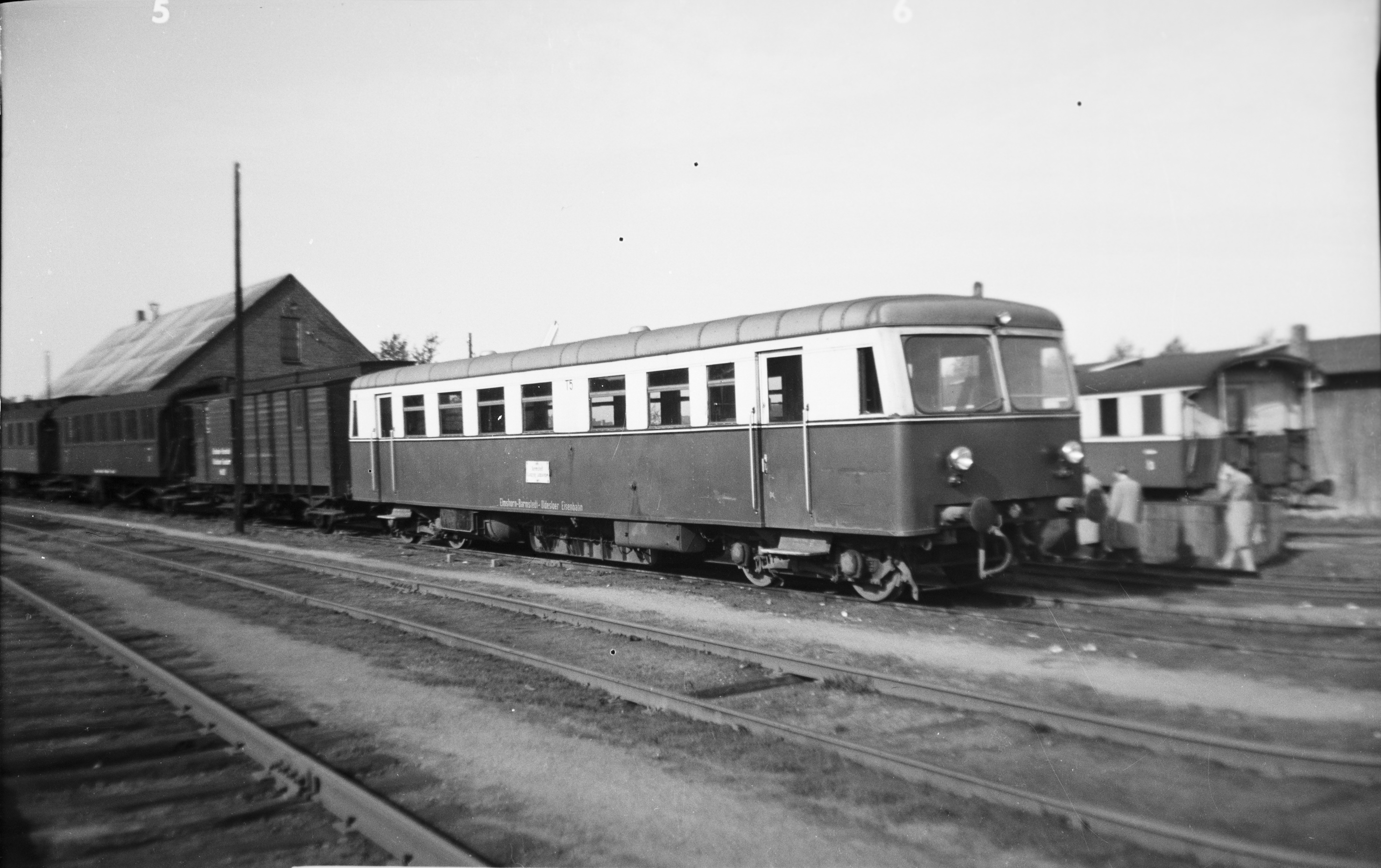 Dieses Bild passt zu einer Reihe weiterer Bilder aus dem Jahre 1958. Die Bilderserie zeigt die abgestellten Triebwagen, Packwagen und Personenwagen im Jahre 1958 neben dem Lokschuppen des Bw Barmstedt. Hier sehen wir den MAN Triebwagen T5 vor dem Packwagen Pw20 und Personenwagen 16. Aufnahme von Manfred Hohmann.