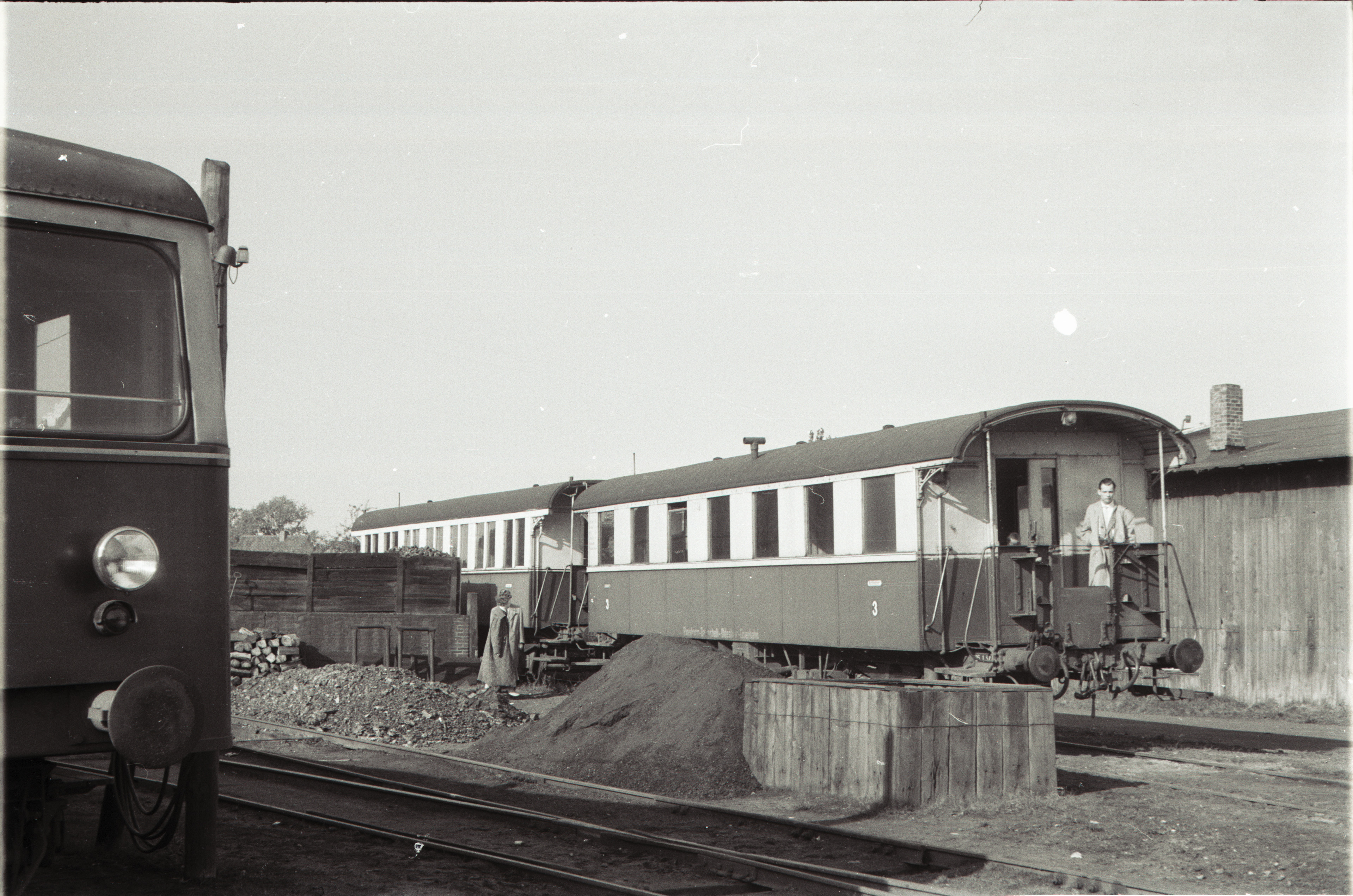 Dieses Bild zeigt den Personenwagen T4b und den farblich passenden Personenwagen 15 im Bw Barmstedt. Vorne links im Bild ist ein Teil des MAN Triebwagen T5 zu sehen. Die Aufnahme stammt aus dem Jahre 1958 von Manfred Hohmann.