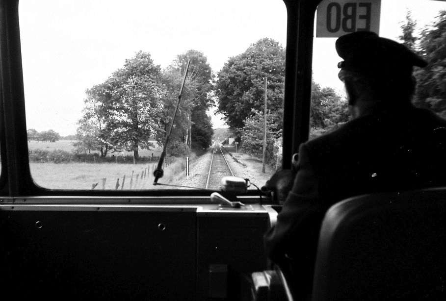 Blick aus dem Triebwagen VT 3.08 auf die Strecke zwischen Bokholt und Vossloch. Im Bereich der großen Bäume liegt der Bf Vossloch. Aufnahme vom 20. Juni 1981.
