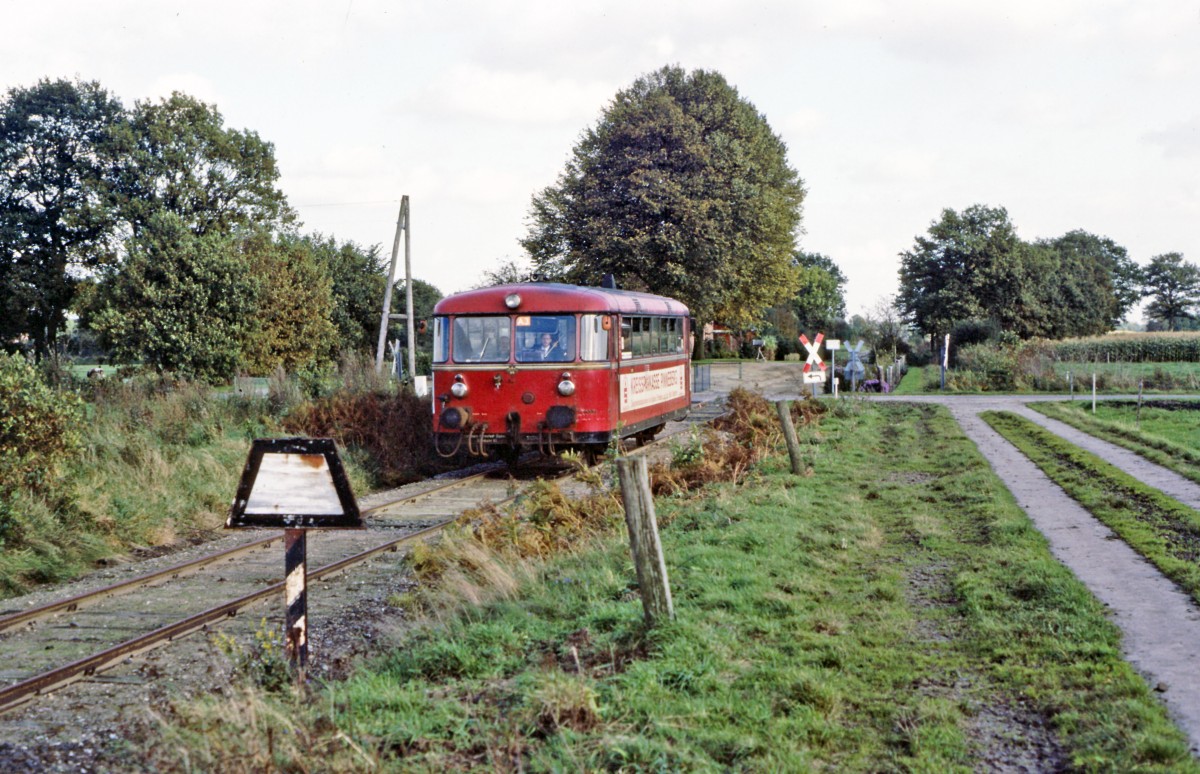 VT 3.08, Ausfahrt ehemaliger Bahnhof Langeln in Richtung Barmstedt, 17.10.1987