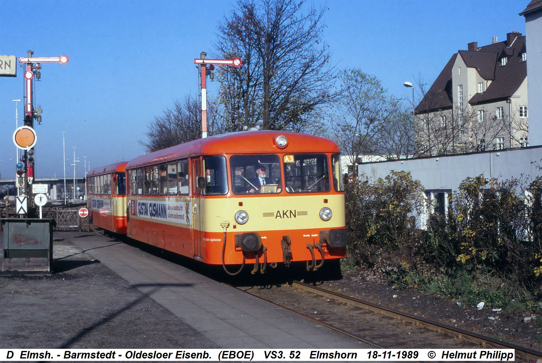 Am 18. November 1989 erreicht ein Zug bestehend aus Steuerwagen VS 3.52 und Triebwagen VT 3.09 den Bahnhof Elmshorn auf Gleis 1a. Die Fahrzeuge tragen schon die neue orange-beige Lackierung der AKN. Aufnahme von Helmut Philipp.
