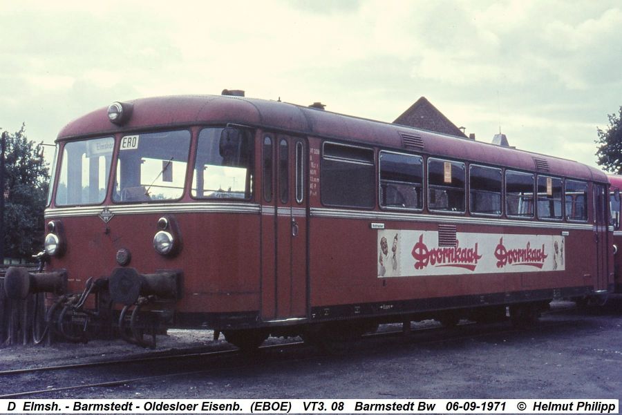 Das Rückgrat im Personenverkehr bis in die achtziger Jahre des vorherigen Jahrhunderts bildeten bei der EBOE die Triebwagen aus dem Hause Uerdingen. Am 6. September 1971 besuchte ich erstmalig das Bw in Barmstedt und fotografierte dort den VT3. 08 auf dem Gelände. Der mit Übersetzfenstern versehene einmotorige (Büssing U10) Triebwagen wurde von Uerdingen 1961 (Nr.68640) an die Bahn geliefert und trug anfangs die Bezeichnung VT28.