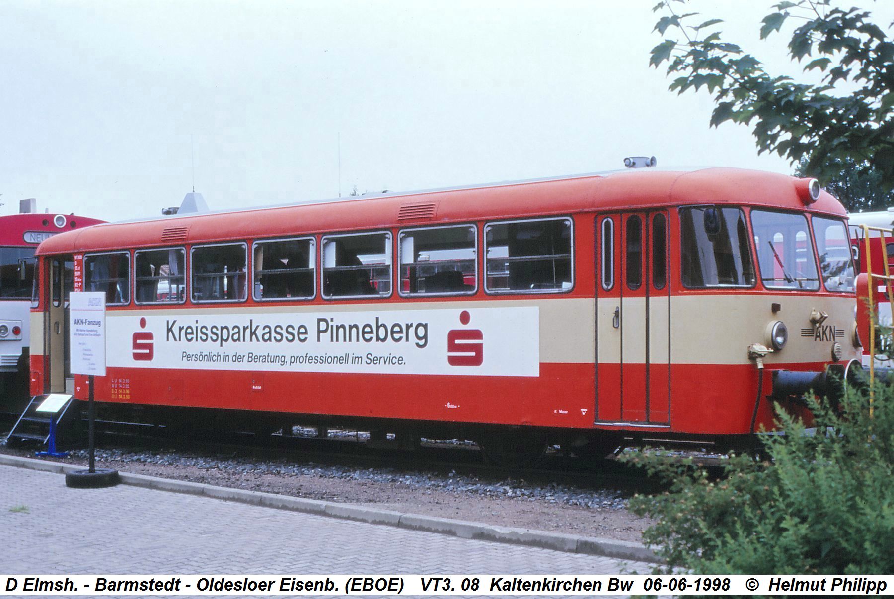 Am 6. Juni 1998 veranstaltete die AKN im Betriebswerk Kaltenkirchen einen Tag der offenen Tür. Anlässlich dieser Veranstaltung konnte auch der Uerdinger Schienenbus VT 3.08 in Kaltenkirchen besichtigt werden. Dieser Triebwagen war bis zur Abbläsung durch die Fahrzeuge der Baureihe VT2E auf der Linie A3 der AKN zwischen Elmshorn und Barmstedt zu Hause. Das Foto wurde von Helmut Philipp aufgenommen.