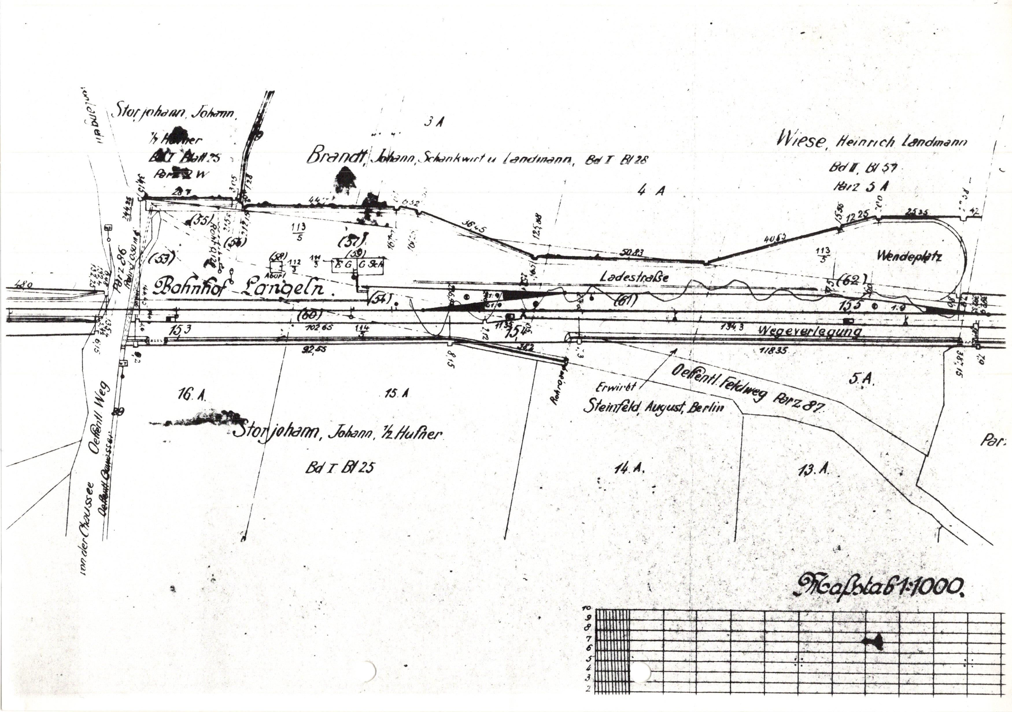 Diese Skizze im Maßstab 1:1000 zeigt den Bahnhof Langeln und umliegenden Felder mit den jeweiligen Eigentümern. Wahrscheinlich stammt diese Zeichnung aus der Zeit der Planung der Verlängerung der Strecke von Barmstedt nach Bad Oldesloe. Da die Strecke 1907 eingeweiht wurde, dürfte die Zeichnung ca. 2 Jahre vorher entstanden sein.